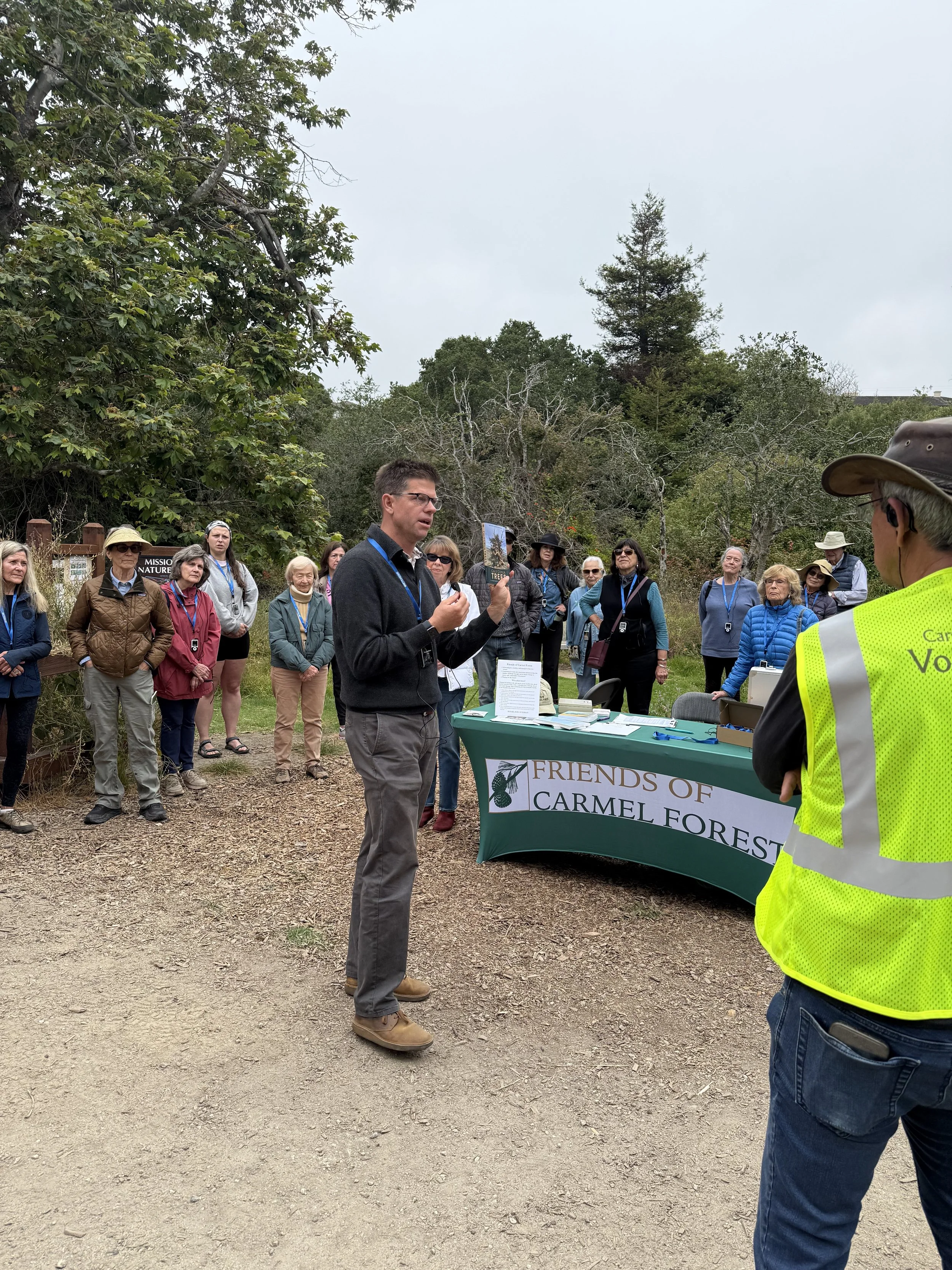 The goal of the tree walk and lecture was to highlight the importance of Carmel’s urbanized forest. “Carmel’s green spaces have challenges – development, climate change and fire safety,” said Ramie Allard, president of Friends of Carmel Forest. “Dr. Ritter is excellent at conveying the importance of our forest and natural habitat in an entertaining and memorable way.”’
